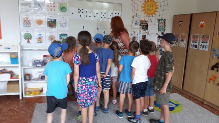 „Nejprve si děti prohlédly přízemí školy, tedy prostor, kde budou trávit nejvíce času, a navštívily místnost první třídy a školní družiny,“ přiblížila dění ve škole vedoucí učitelka mateřské školy Mgr., Bc. Renata Dreslerová, DiS. Tam čekaly děti různé aktivity: z kostiček vytvářely barevnou řadu dle instrukcí a zároveň si přitom zopakovaly barvy v angličtině nebo na obrázku léta vyhledávaly dopravní prostředky, kterými můžou cestovat na dovolenou. Taky pracovaly s magnetickou tabulí, kam přiřazovaly k číslům počet teček z kostky.