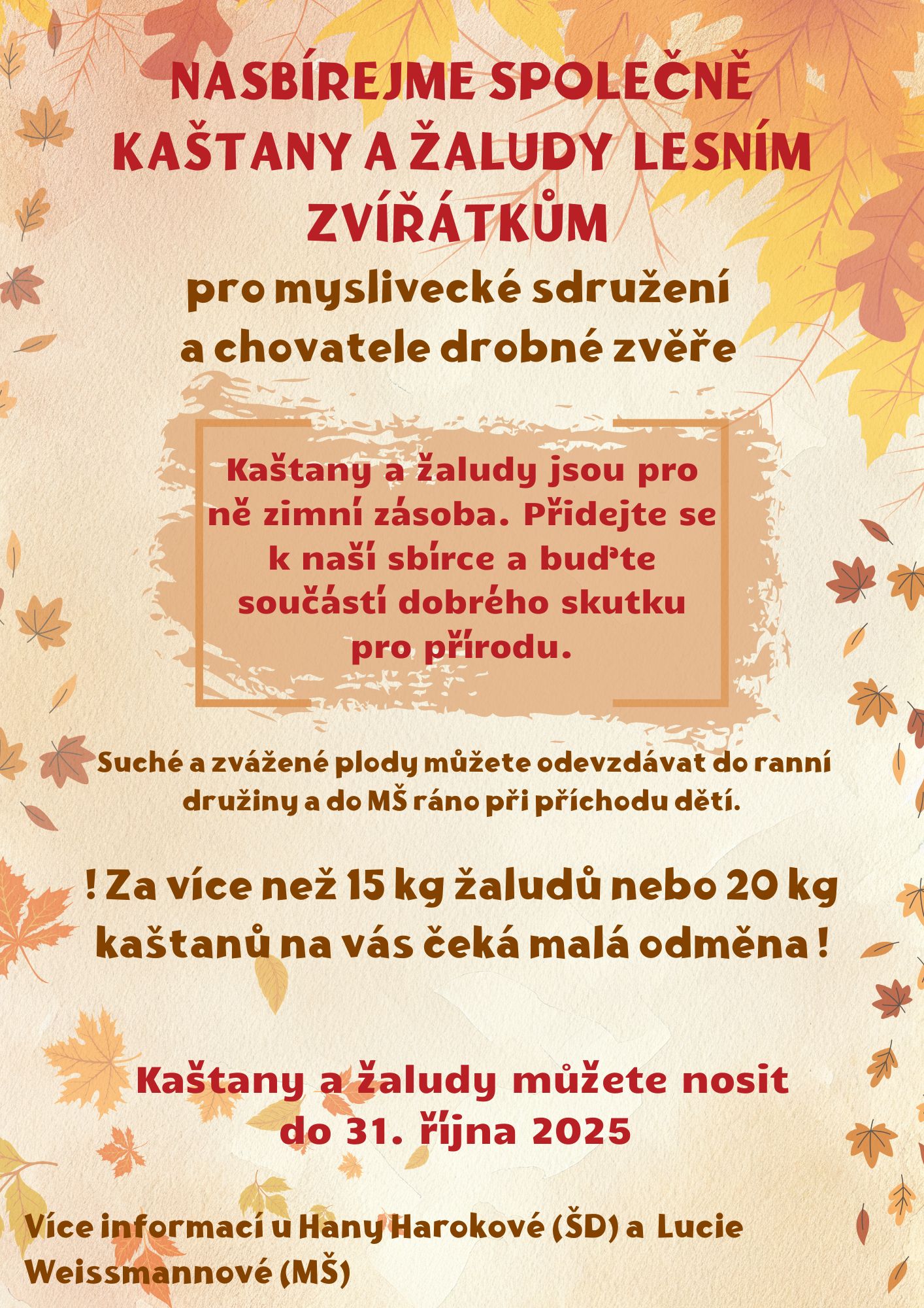 Podzim je tady a s ním i možnost pomoci přírodě. Jako každý rok se i letos můžete zapojit do každoroční podzimní soutěže naší mateřské školy a školní družiny ve sběru kaštanů a žaludů.