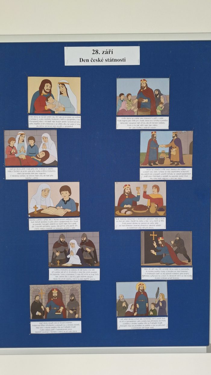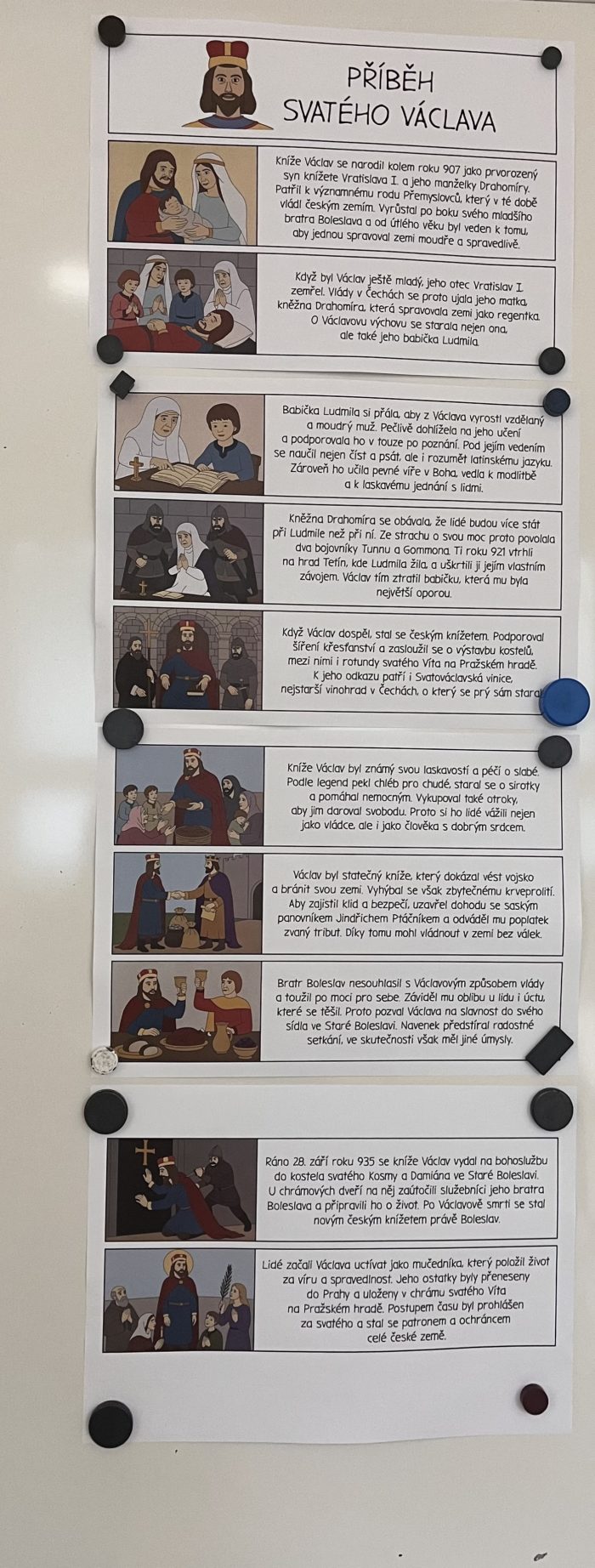 Ve čtvrteční hodině vlastivědy bylo opravdu rušno. Polovina žáků dostala krátký úryvek ze života svatého Václava a k němu si museli najít parťáka, který si vylosoval k tomuto úryvku obrázek. Vznikly tak dvojice obrázků s příběhem. Poté bylo třeba celý obrázkový příběh chronologicky uspořádat.  „Všichni žáci se do aktivity pustili s nadšením,“ vzpomíná Olga Síbrtová s tím, že v druhé části hodiny se páťáci ve svých dvojicích vydali po třídě a chodbě hledat kartičky s otázkami ke svatému Václavovi, které je při správném zodpovězení měly dovést až k tajence: Na svatého Václava babí léto nastává. „Aktivita byla fajn, myslím, že děti moc bavila. Cennou pomocnicí nám při luštění byla také asistentka pedagoga Míša Vymětalová,“ vzkazuje slova díků Olga Síbrtová.