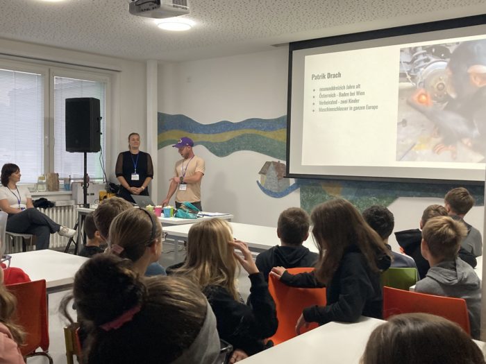 Druhá část letošního projektového dne nabízela trochu odpočinku od práce na projektech, kterou žáci v průběhu dopoledne přerušili jen jednou. Bylo to kvůli vzácné návštěvě v jídelně – rodilému Rakušanovi panu Patriku Drach, jeho manželce Pavlíně a učitelce angličtiny frýdlantského gymnázia BMA paní Monice Čevelové. Ti si pro naše žáky připravili poutavou a praktickou prezentaci plnou zajímavostí nejen o sobě, ale také o evropských jazycích.