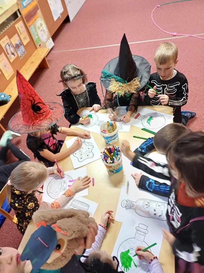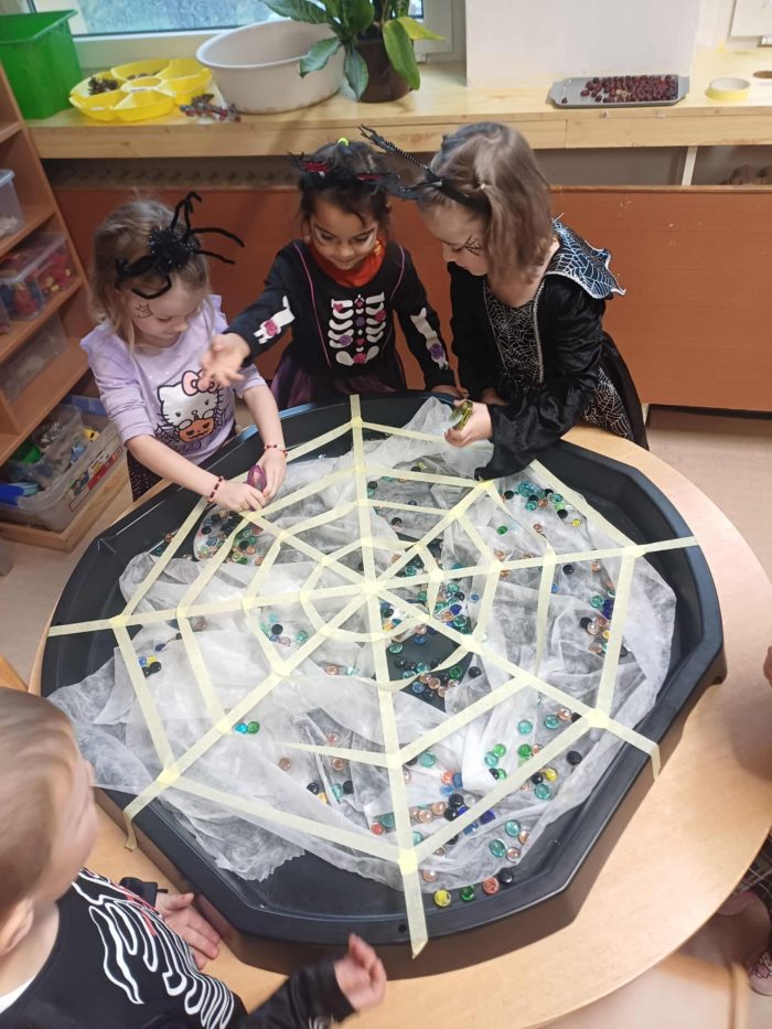 V průběhu pátečního dopoledne děti skládaly kouzelný lektvar podle předlohy, procvičovaly jemnou motoriku při hledání kamínků v pavoučí síti i při provlékání tematických motivů. Velký úspěch mělo modelování pavoučků z plastelíny a také tvoření kouzelnických hůlek ze samotvrdnoucí hmoty.