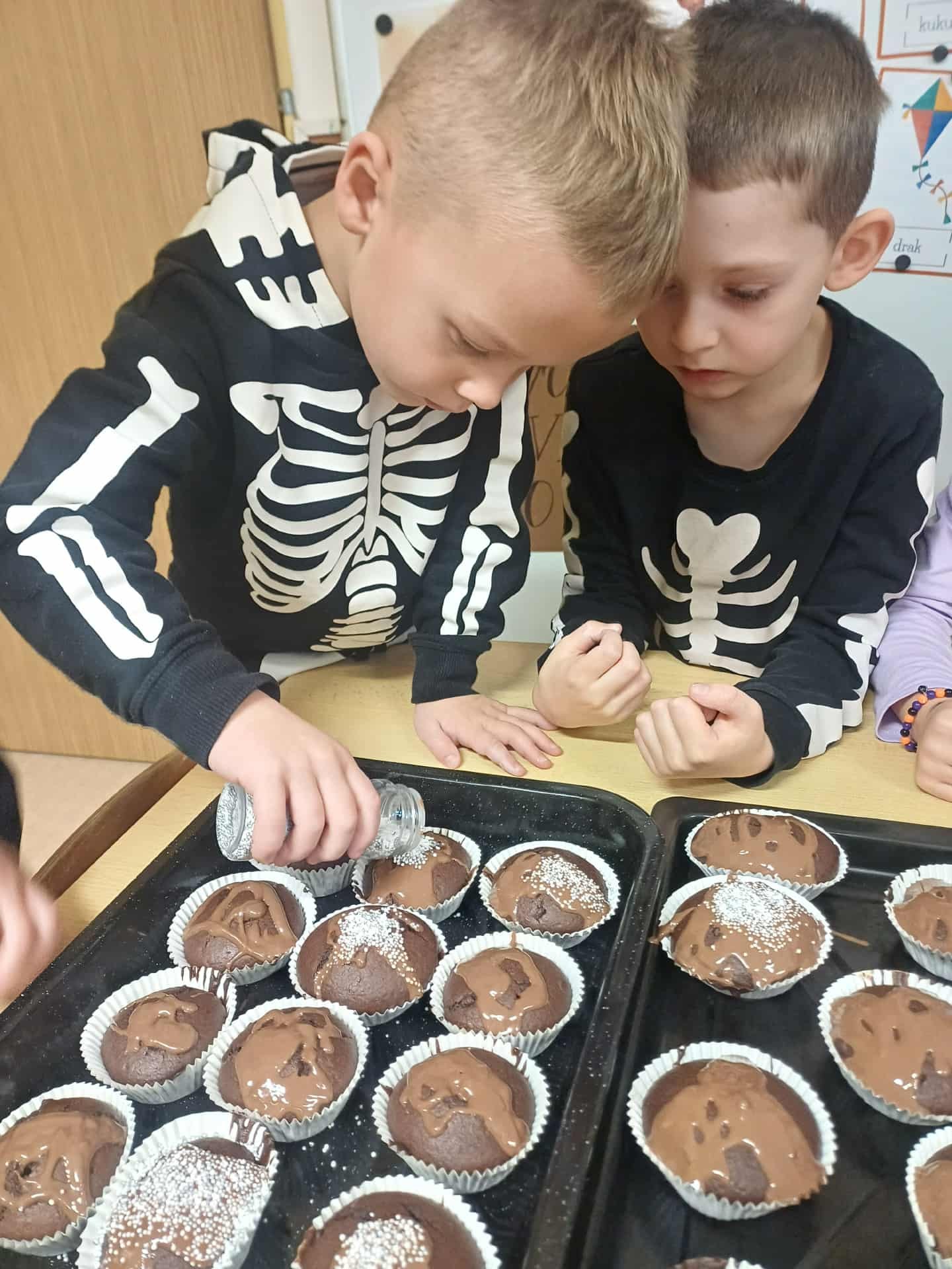 Celou třídou se také nesla vůně čokolády během pečení kouzelnických muffinů, které si děti samy následně nazdobily. Po svačince se konala promenáda v maskách, a to nejen v prostorách školky, ale také celé školy. Motýlci navštívili sborovnu i ředitelnu a s hrdostí předvedli své kostýmy. Kouzelnický muffin dali ochutnat také paní ředitelce. Celotýdenní program zakončilo halloweenské focení u strašidelné nástěnky v šatně, ze kterého vznikly krásné snímky do portfolia dětí.