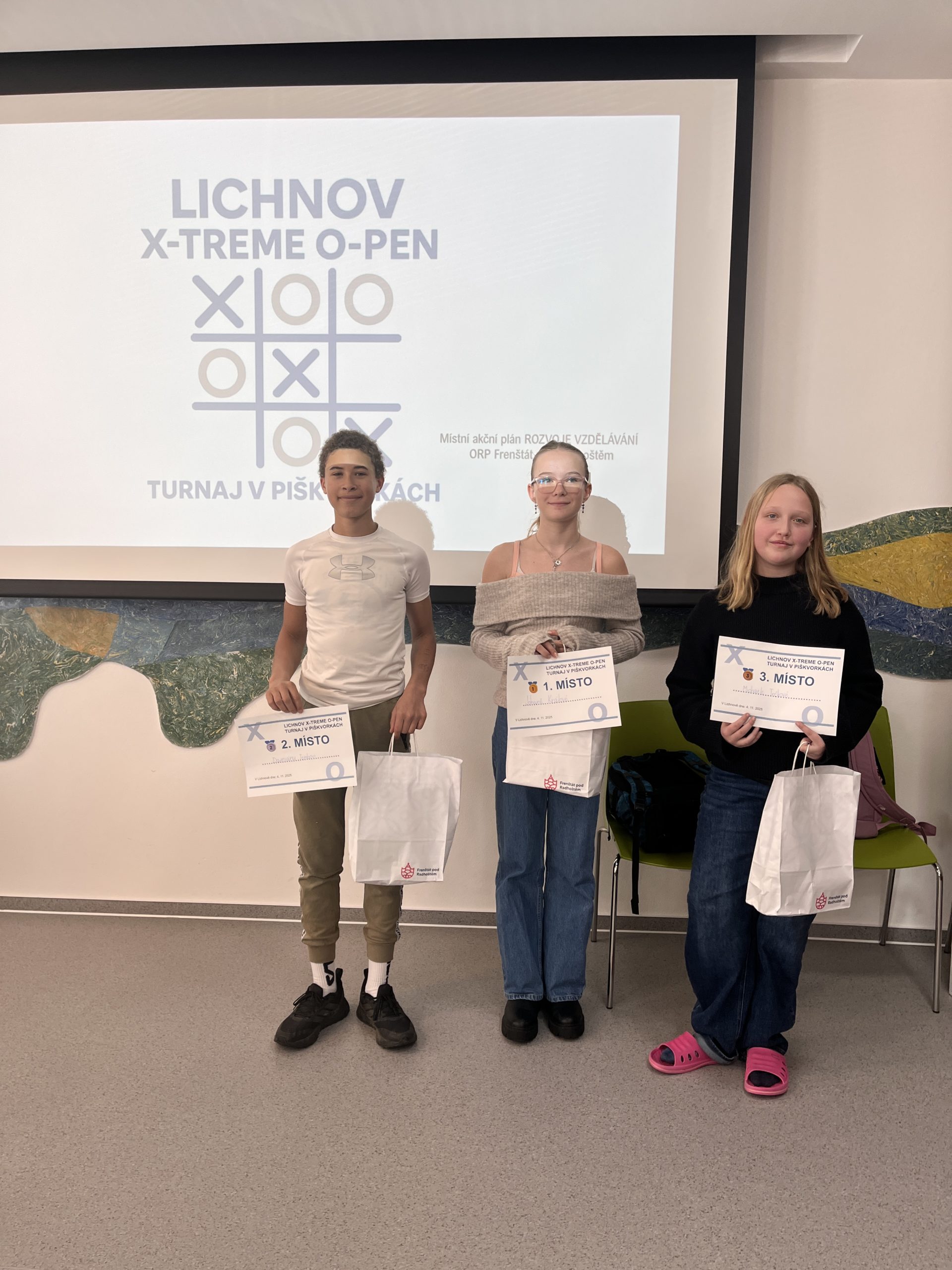 Na turnaj v oblíbené strategické hře piškvorky se do Lichnova v úterý 4. listopadu 2025 sjeli žáci ze Základní školy Tyršova a gymnazisté z Frenštátu pod Radhoštěm. První ročník této nově vznikající meziškolní soutěže organizované na půdě naší školy proběhl ve spolupráci s MAP ORP Frenštát pod Radhoštěm.