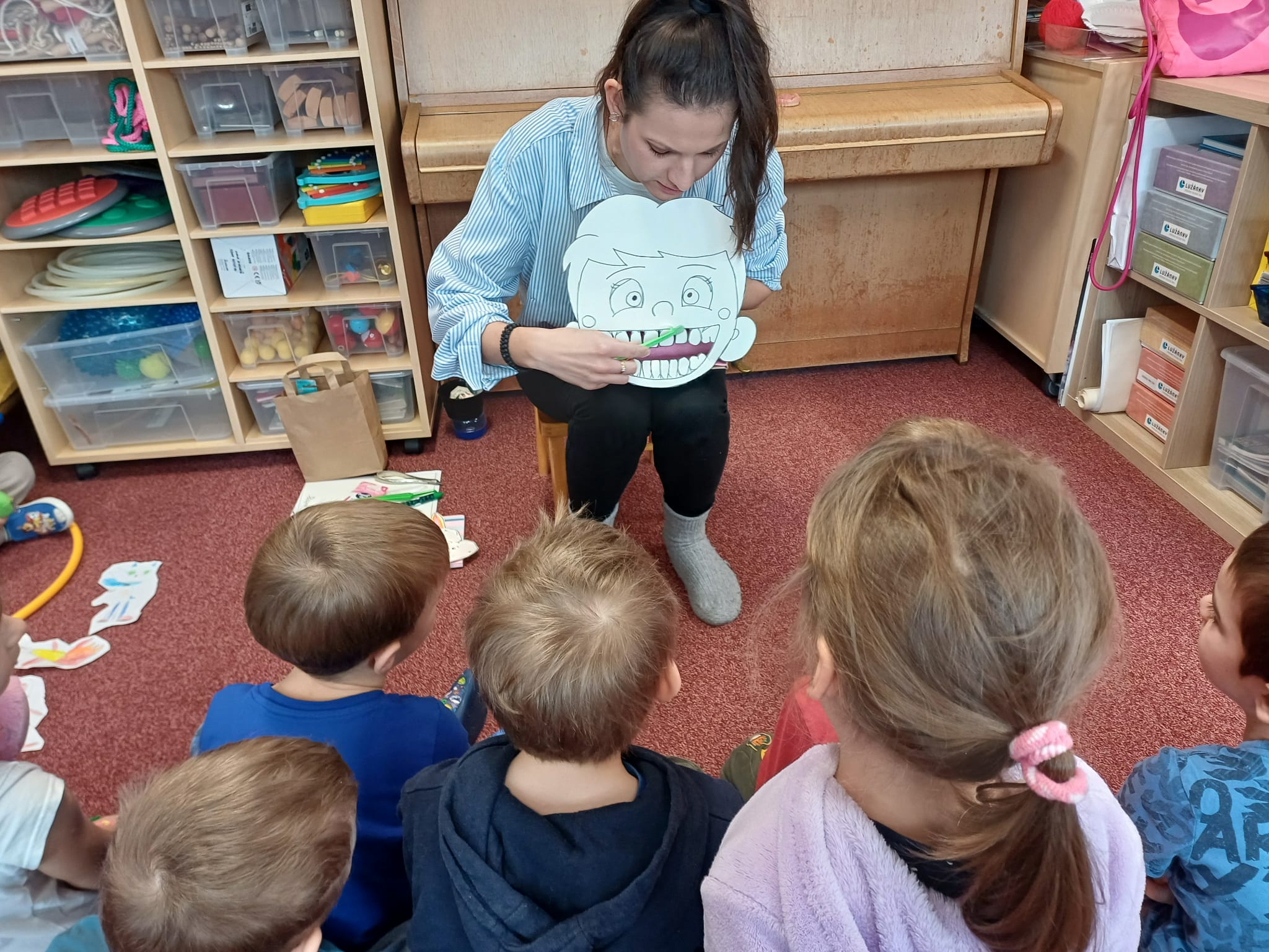 Pomocí ukázky na velkém modelu úst si děti prakticky vyzkoušely správnou techniku čištění. Paní Špačková, která je mimo jiné i zubní technička, dětem zodpověděla jejich dotazy a sdílela užitečné tipy, jak se o svůj chrup starat každý den. Děti byly aktivní, zvídavé a s velkým zaujetím se zapojovaly do všech aktivit.