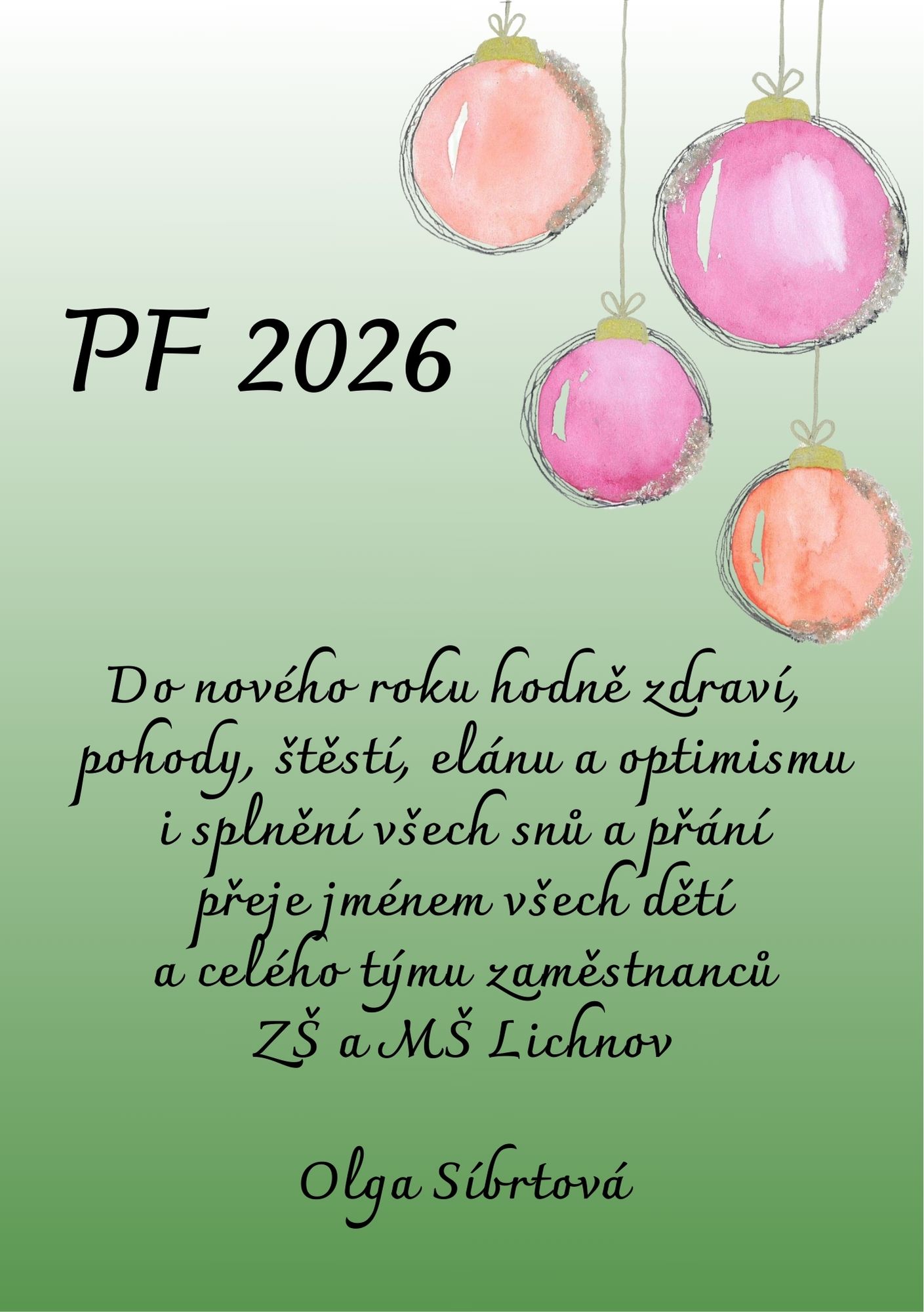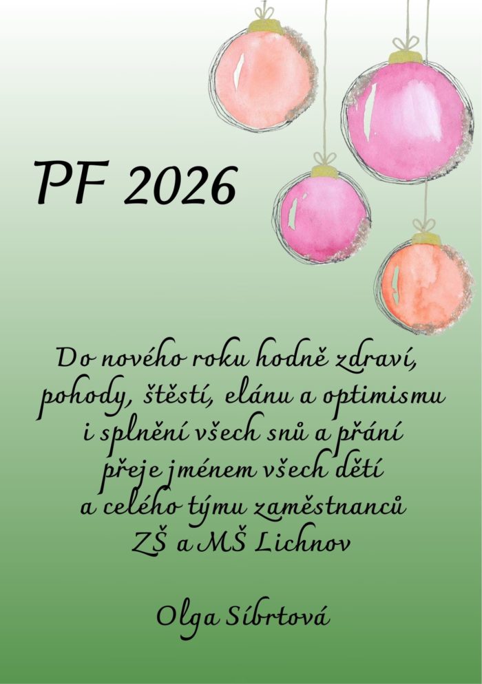 Novinky/Novinky MŠ/Novinky ZŠ Přání do nového roku Posted on 18. 12. 2025 Vážení rodiče a přátelé školy, rádi bychom Vám při příležitosti závěru roku vyjádřili srdečné díky za Vaši dosavadní přízeň. Těšíme se na další spolupráci i společná setkání v roce 2026. Mgr. Olga Síbrtová rp View all posts by rp →