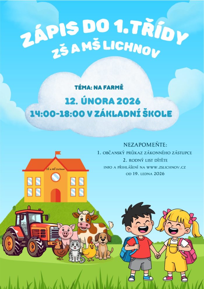 zápis do první třídy pro školní rok 2026/2027 proběhne ve čtvrtek 12. února 2026 od 14 do 18 hodin ve škole za přítomnosti zákonných zástupců a dětí, které mají v příštím školním roce nastoupit do první třídy. K zápisu se mohou dostavit všechny děti narozené od 1. září 2019 do 31. srpna 2020 a děti, kterým byla v minulém školním roce povinná školní docházka odročena.
