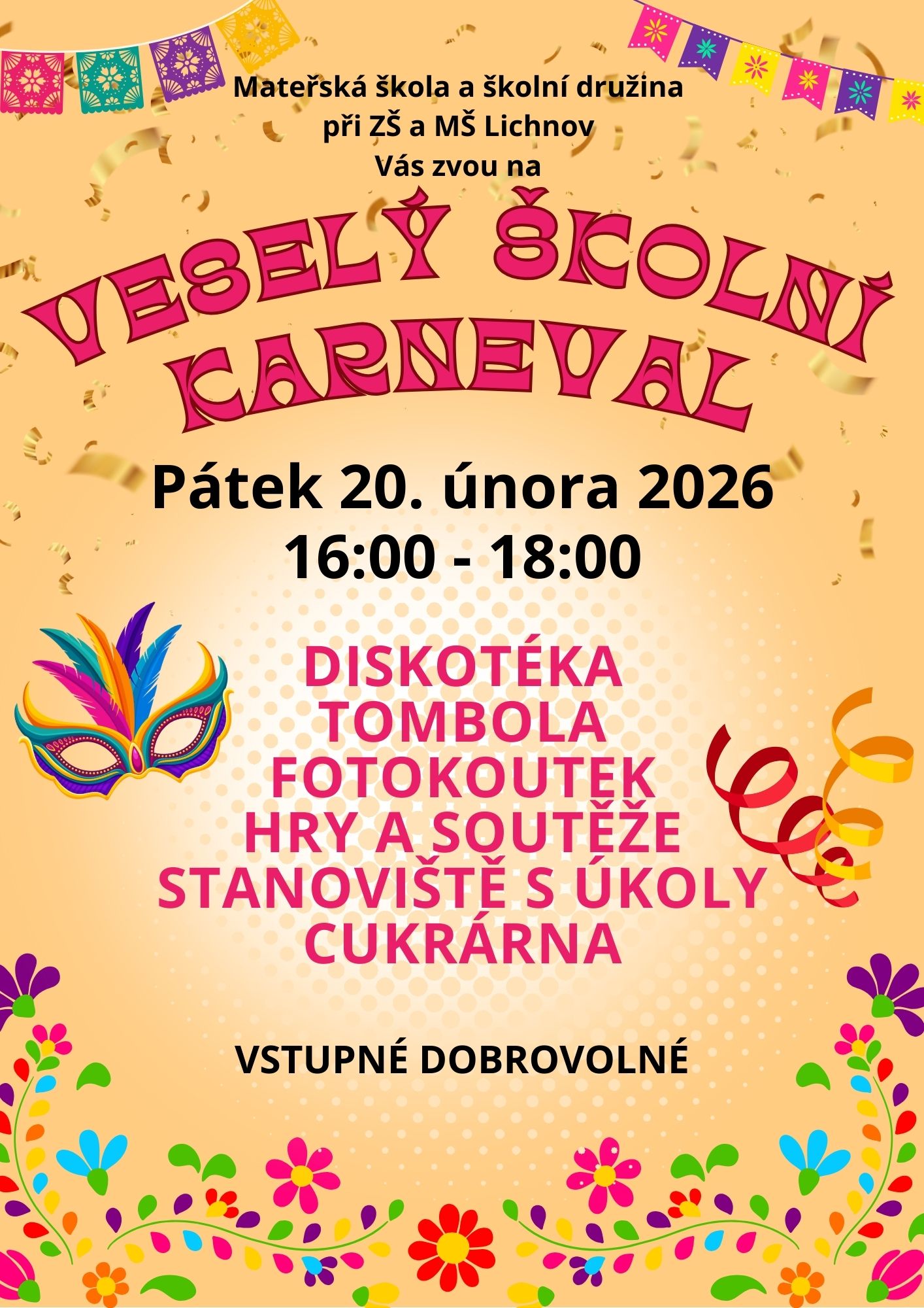Veselý školní karneval nabídne bohatý program plný her, soutěží, tance a zábavy. K příjemné atmosféře jistě přispěje i cukrárna, kde budete mít možnost ochutnat občerstvení, které pro Vás připraví naši žáci.