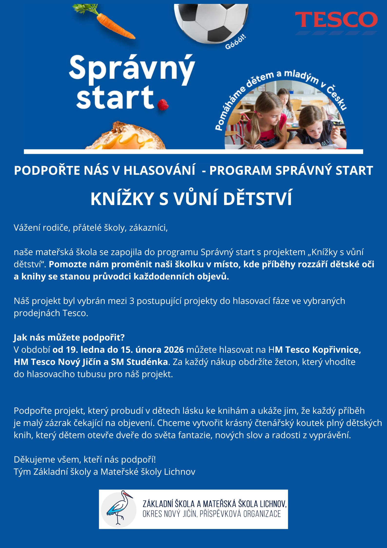 Naše mateřská škola se i letos zapojila do programu Správný start s projektem Knížky s vůní dětství. Náš projekt byl vybrán mezi tři postupující projekty do hlasovací fáze ve vybraných prodejnách Tesco. Od 19. ledna do 15. února 2026 bude záležet na zákaznících v řetězci Tesco, konkrétně v pobočkách v Kopřivnici, Novém Jičíně a Studénce, zda náš projekt v hlasovací fázi podpoří. Pomoci nám může každý žeton zákazníka, který obdrží při nákupu, vhozený do příslušného tubusu naší školy.
