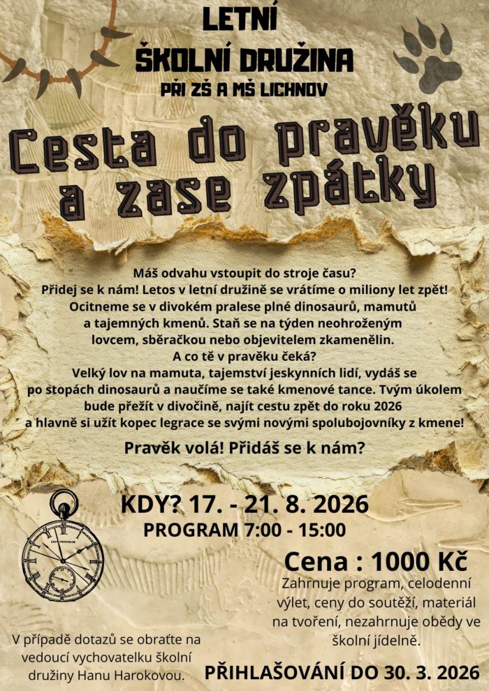 Přihlášku k letní družině najdete na webu školy zde. Vyplněnou ji odevzdávejte na sekretariátu školy do pondělí 30. března 2026.