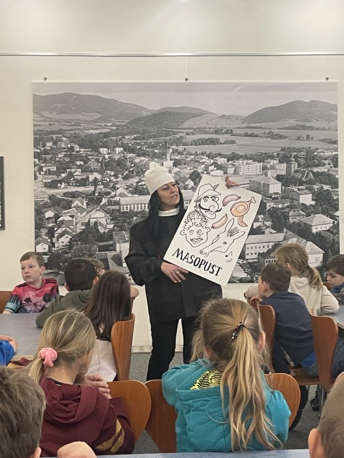 „Vedoucí akce nás přišly přivítat v kostýmech ženicha a kominíka. Na tyto kostýmy poté navazovalo i povídání o masopustních maskách a masopustním průvodu. Celý program byl zaměřen na období od Masopustu do Velikonoc,“ zmiňuje učitelka a hlavní organizátorka výjezdu Mgr. Kateřina Martinková.