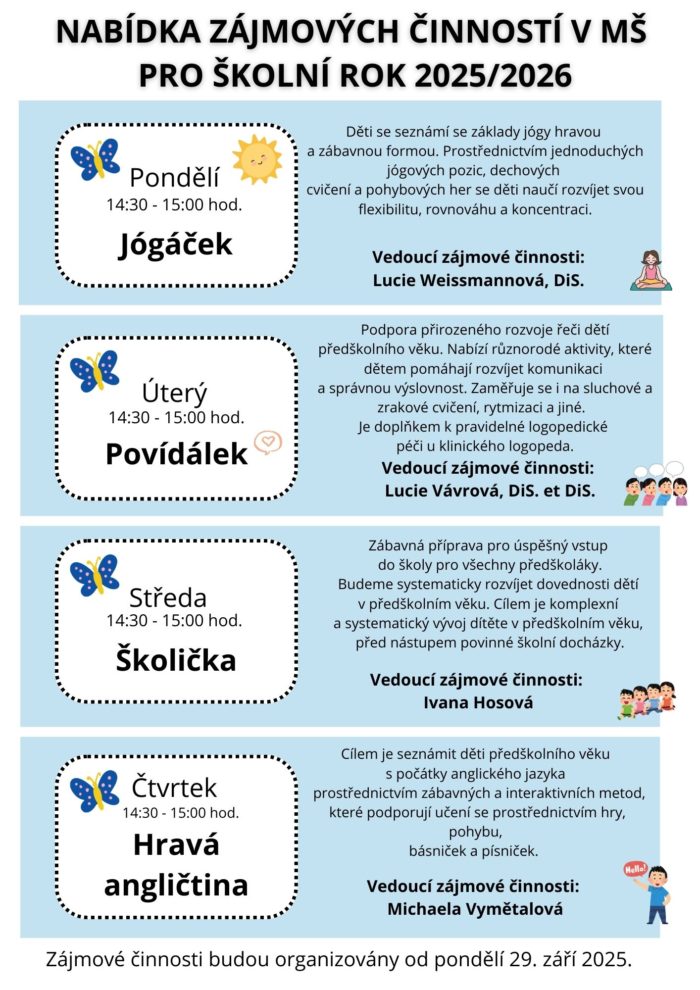 rádi bychom Vás informovali o nabídce zájmových činností, které budou probíhat v naší mateřské škole v letošním školním roce 2025/2026. Tyto činnosti povedou naši pedagogičtí pracovníci z mateřské i základní školy v jednotlivé dny ve stanoveném čase od 14:30 do15:00 hodin.