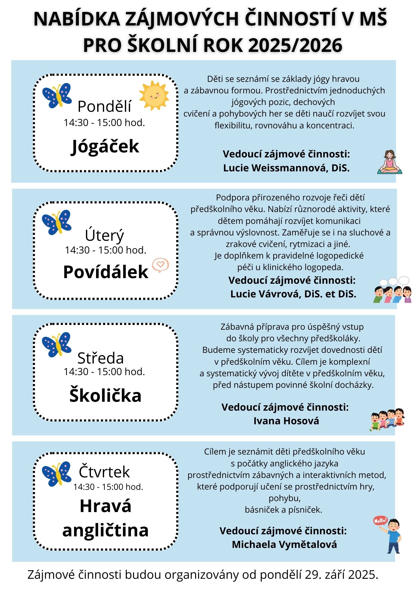 Nabídka zájmových aktivit v mateřské škole pro školní rok 2025/2026