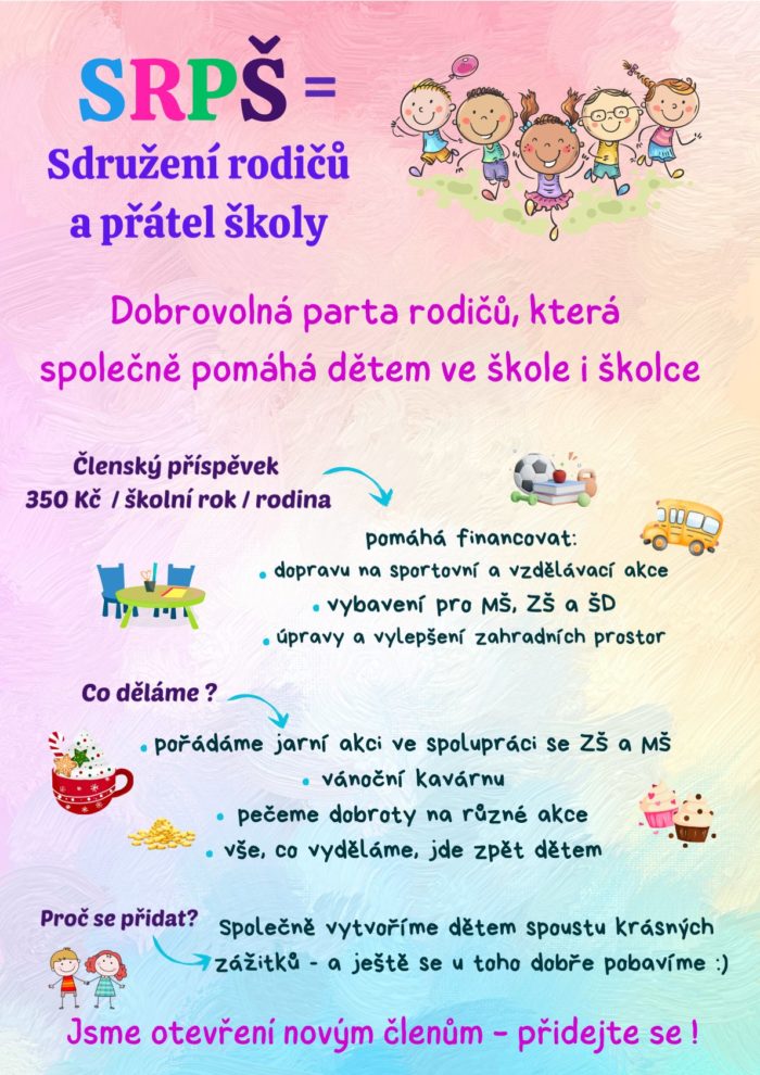 SRPŠ při naší škole byl založen v roce 2018 za účelem pomoci škole, a to v rovině dobrovolné pomoci rodičů při akcích pořádaných školou nebo zabezpečení vlastních akcí. Spolek se také podílí na financování nadstandardních aktivit dětí a žáků, jako je doprava na soutěže, ceny do soutěží, odměny pro žáky, podpora finančně náročnějších aktivit (lyžařský výcvik), podpora projektu Lichnov: Pošli to dál a také nákup materiálního vybavení.